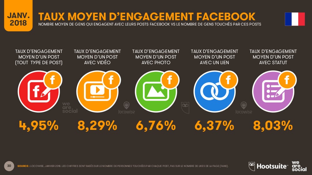 - Le taux d’engagement moyen d’un post avec vidéo sur Facebook est deux fois supérieur au taux d’engagement moyen
