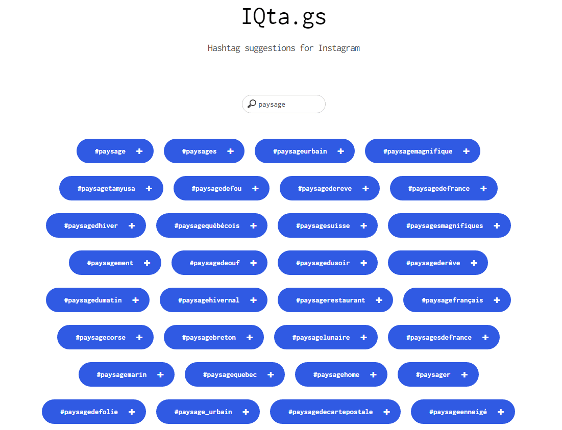 Enfin, autre possibilité, plus efficace, utiliser une appli ou un site web qui vous fera des suggestions de mots clés pertinents. J’ai récemment découvert un nouveau service, IQta.gs, oui un énième, mais qui a le mérite d’être clair, rapide et sans pub, ce qui vaut d’être souligné.
