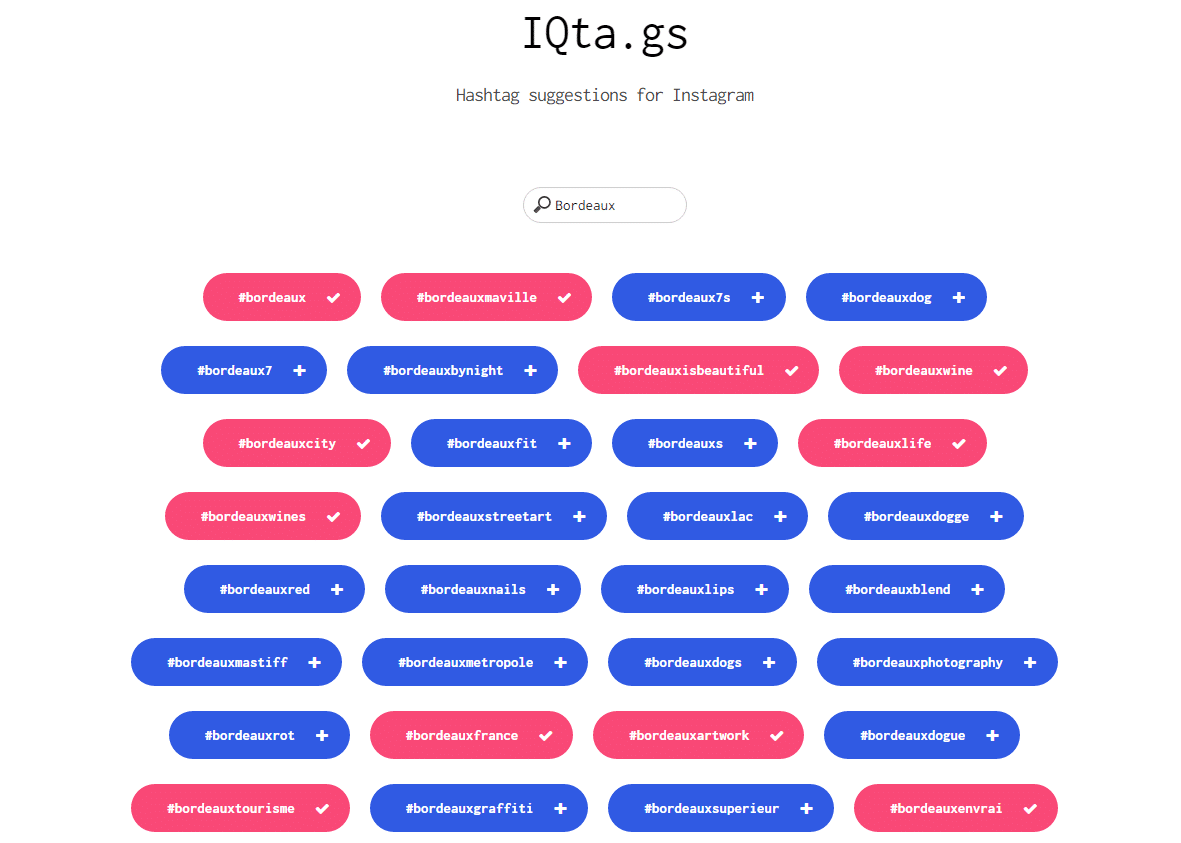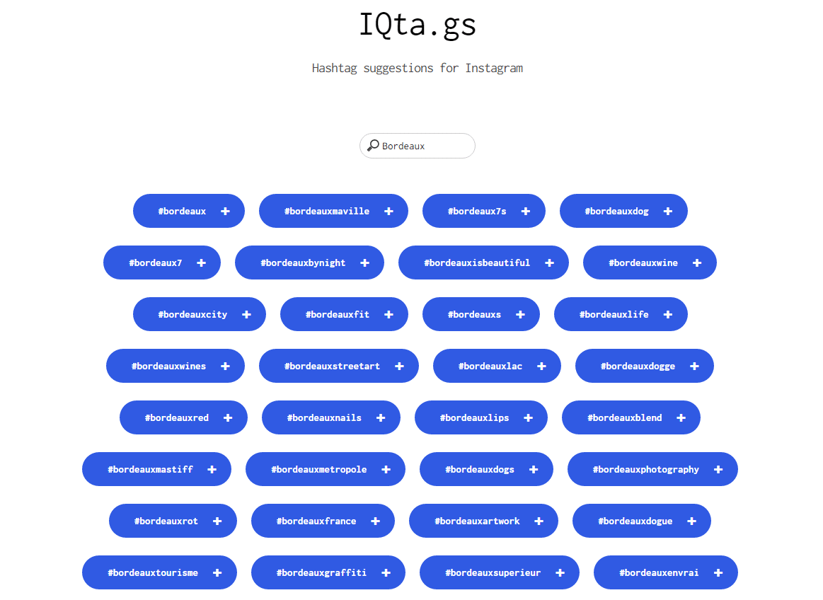 IQTa.gs est effectivement ultra simple d’utilisation. Après avoir effectué une recherche sur le site, le service vous propose jusqu’à 100 hashtags Instagram, les plus fréquemment utilisés et les plus spécialisés. Il est possible d’en sélectionner jusqu’à 29, puis il reste à cliquer sur « Copy to clipboard » en haut à droite de la page et automatiquement tous les hashtags choisis sont enregistrés dans le presse-papier, il n’y a plus qu’à les coller en commentaire de sa photo Instagram, facile non ?
