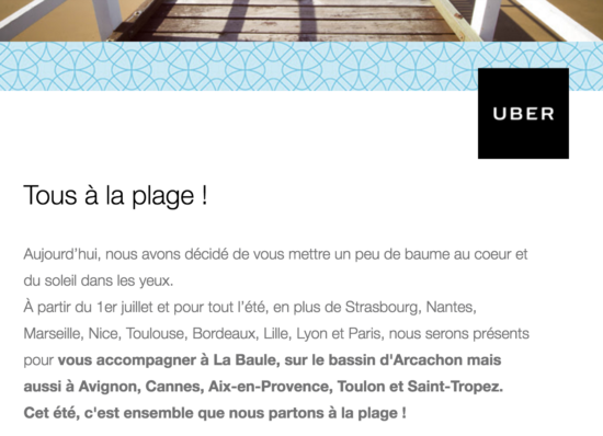 On ne peut pas dire que la situation ce soit améliorée ces derniers mois ! On a vu à en France ces derniers temps une forte tension s’installer entre le trio Taxis – Uber – Politiques, et bien que cela ce soit calmé, rien n’est réellement réglé. Cela n’empêche pas Uber de continuer à se développer, comme en témoigne cet email reçu il y a deux semaines, annonçant un service estival dans quelques grandes destinations côtières.