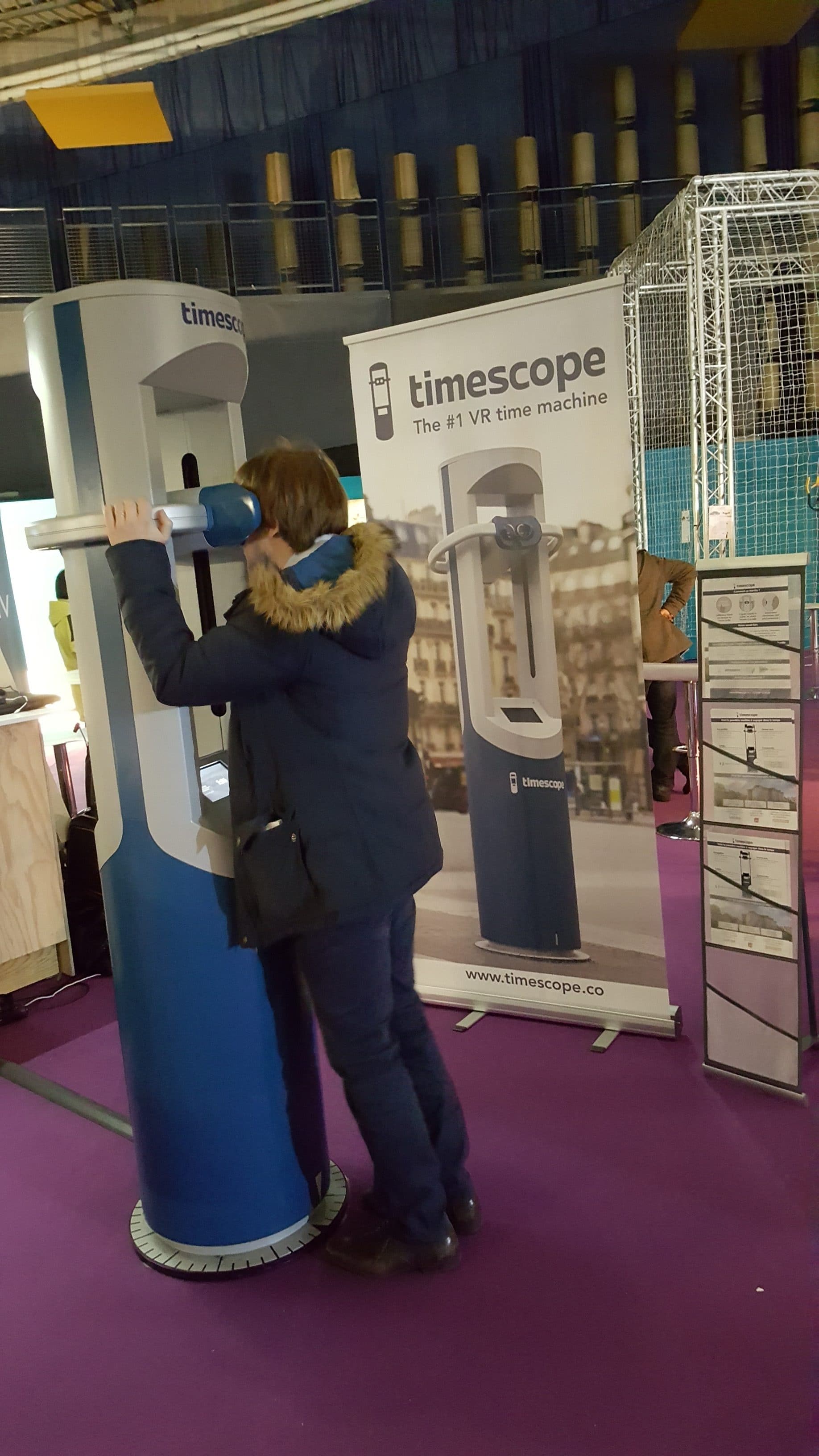 On pourrait imaginer ça sur un salon ou un lieu de promotion pour se distinguer en présentant des expériences touristiques de manière spectaculaire et sans casque. Attention à l’effet « waouh » qui peut rapidement se banaliser avec la multiplication des équipements. - le Timescope, une borne permettant au touriste de découvrir un lieu à travers les âges et sous tous les angles (la borne tourne à 360°)