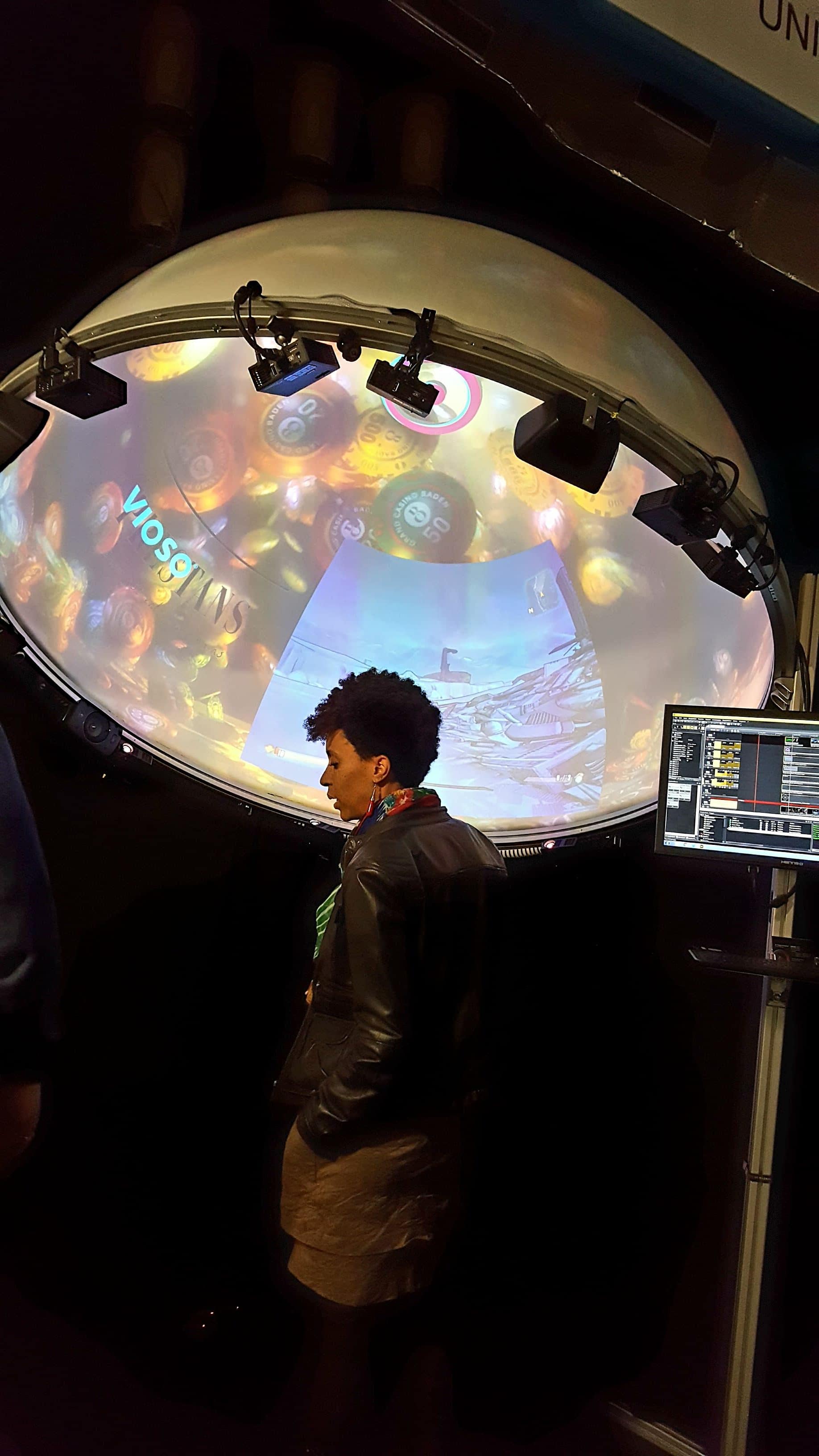 J’ai trouvé l’idée astucieuse pour éviter les interfaces tactiles souvent encombrantes dans le plan vertical et accessoirement pas très hygiéniques… - une espèce de coupole bardée de projecteurs qui offre l’effet d’un cinéma à 360° individualisé
