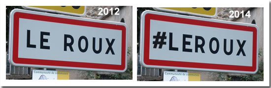 Et demain, soyons fous, imaginons que la notion de Hashtag se généralise, se structure au sein d’une entité nationale fédérant les offices de tourisme 🙂 et pour chaque village, pour chaque ville ou plus pertinent encore pour chaque #DestinationTouristiquePertinente, il est défini un hashtag qu’on matérialise de suite sur un panneau qui existe partout en France… Ceci est bien sûr un cyber affichage de Le Roux en Ardèche.
