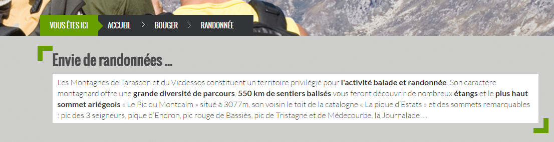 Je suis encore stupéfait de voir que des demandes récurrentes à l’accueil ne génèrent pas de réponses sur le site Internet du territoire. Et la randonnée est une demande récurrente. Lorsque le site internet est construit à partir d’une base de données de prestataires, on « SITise » les rubriques, et au bout de cinq clics pour trouver des propositions de randonnée, l’internaute aura comme info l’adresse du prestataire local qui propose des randonnées accompagnées.